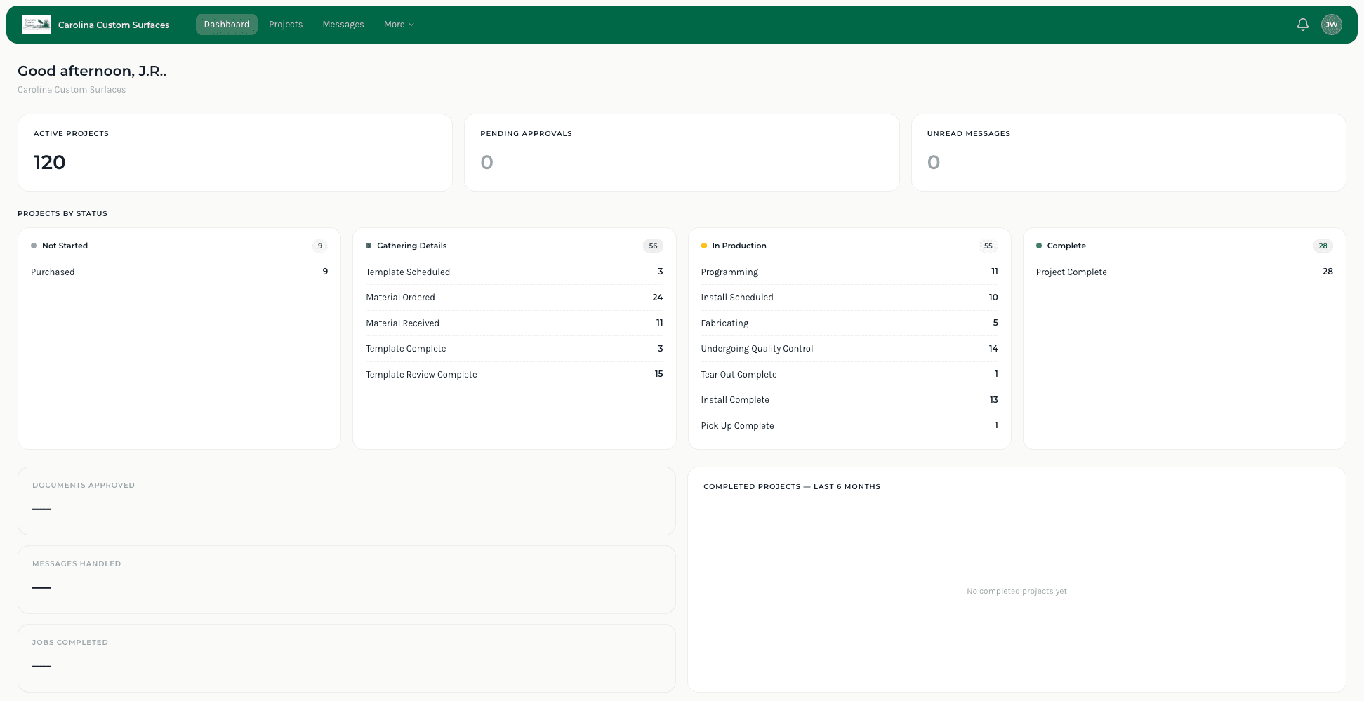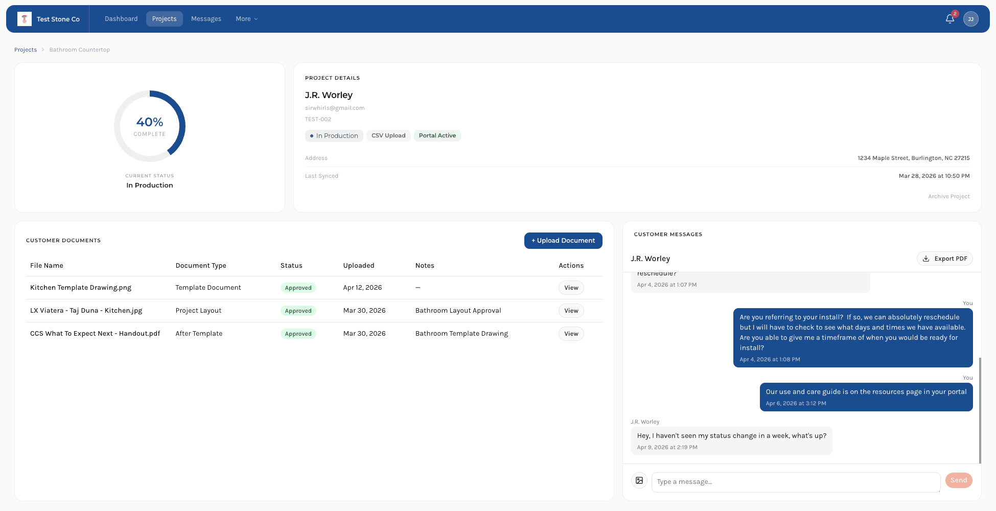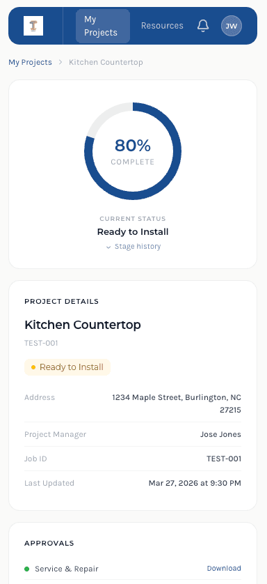 Most shops do a great job of scheduling, but the weeks between template and installation are often a “blind spot” for the customer. When homeowners or builders invest significantly in their surfaces, that lack of visibility leads to anxiety and unnecessary inbound calls — distracting your team from the work that actually moves projects forward.